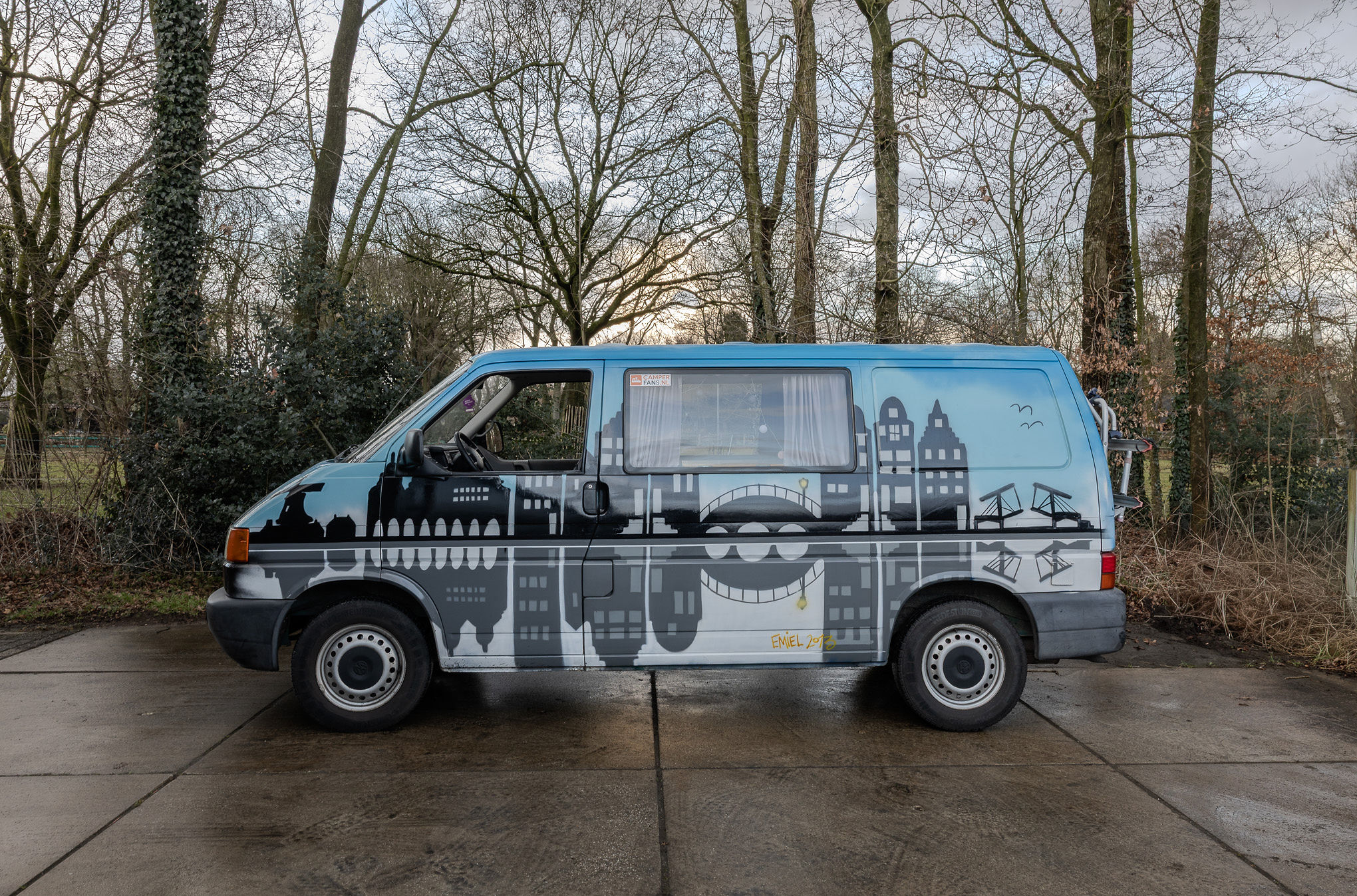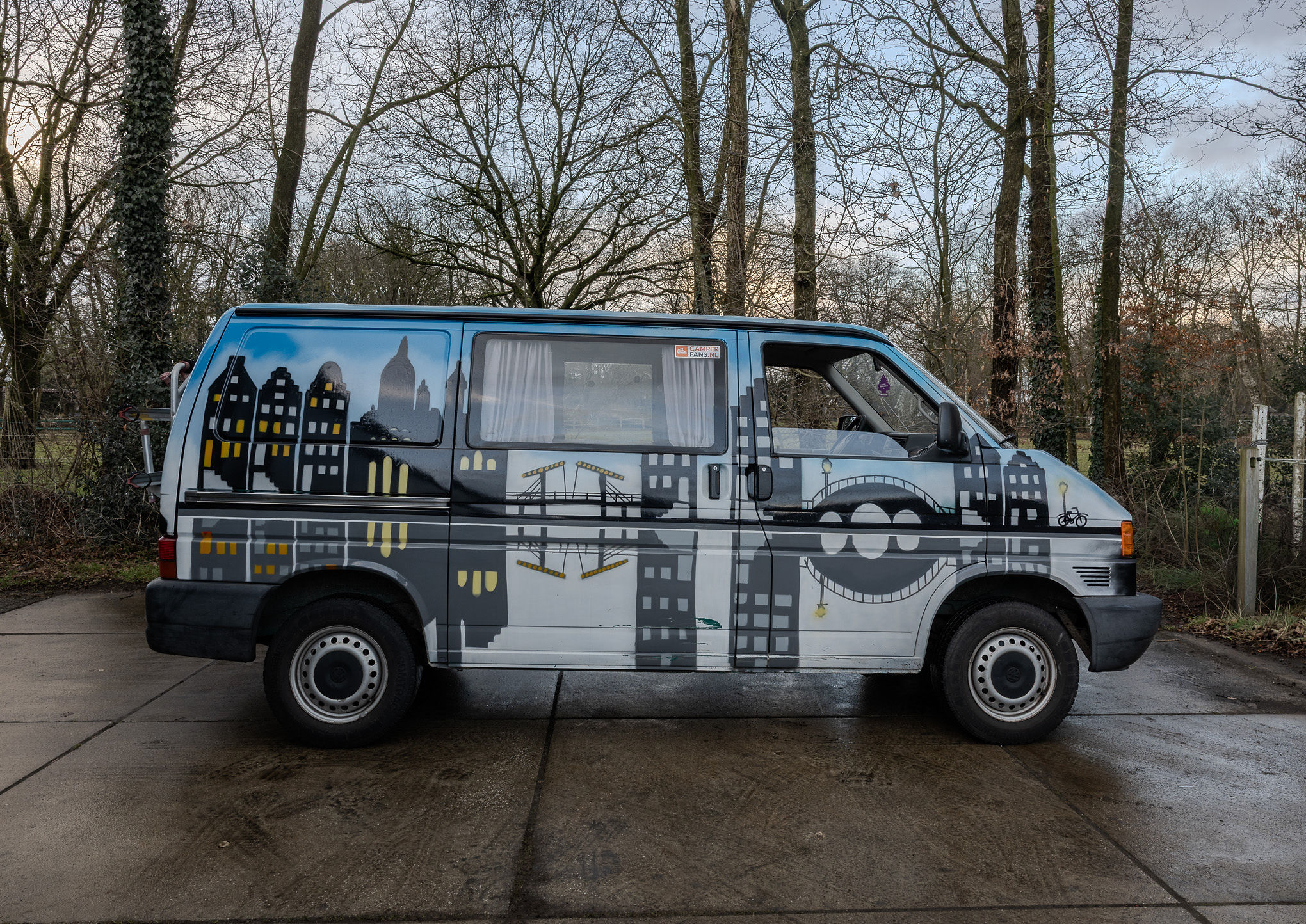 Deze unieke camper is beschilderd in een herkenbaar Amsterdam-thema en biedt alles voor een ontspannen reis. Binnen vind je een comfortabel Queen size bed, een opklapbare tafel en voldoende opbergruimte. De keuken onder de achterklep is praktisch ingericht, met twee losse kookplaatjes zodat je eenvoudig buiten kunt koken, waar je ook bent.