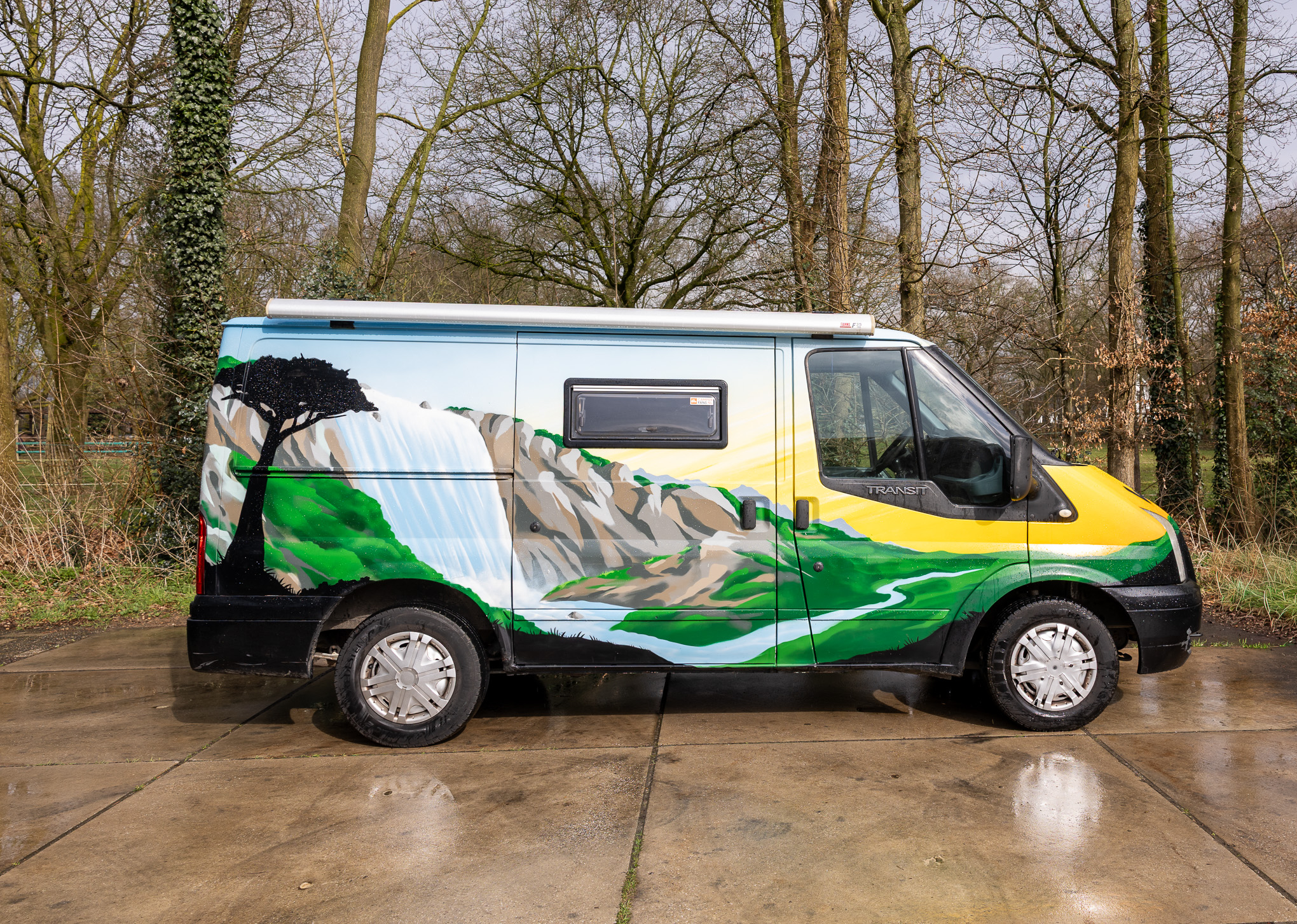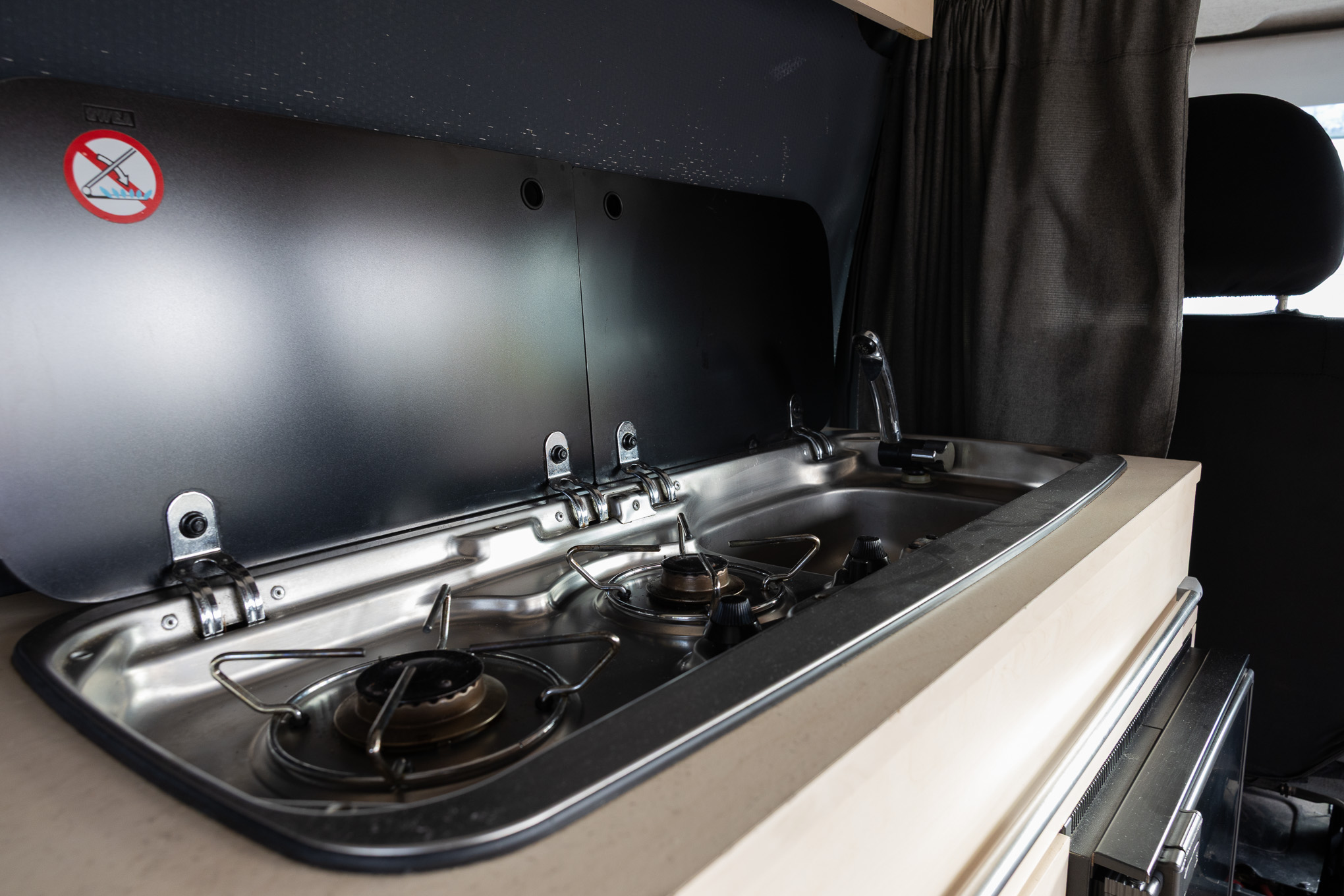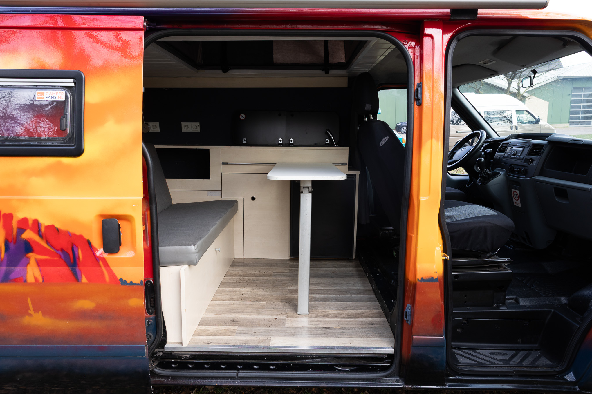 De camper Waterfall is slim ingericht om optimaal van de buitenlucht te genieten. Binnen vind je een heerlijk Queen size bed, een handige opklapbare tafel en volop opbergruimte voor al je bagage. Het keukentje bevindt zich strategisch onder de achterklep; met de twee losse kookplaatjes kook je eenvoudig beschut onder de klep of verplaats je je keuken naar een gezellig tafeltje in het gras.